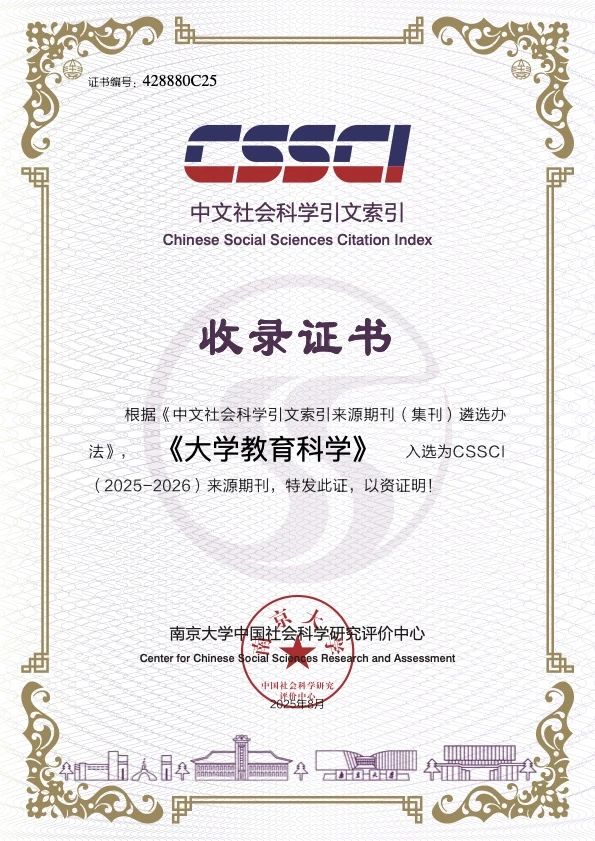 近日,我们刊物《大学教育科学》编辑部收到南京大学中国社会科学研究评价中心收录证书,《大学教育科学》入选CSSCI(2025—2026)来源期刊。