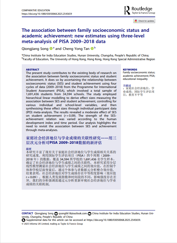 近日,我们宋琼将老师与香港大学教育学院合作的研究在国别与比较教育研究领域取得新进展。该研究以 “The association between family socioeconomic status and academic achievement: new estimates using three-level meta-analysis of PISA 2009–2018 data”为题,发表于比较教育学领域权威期刊《Comparative Education》。