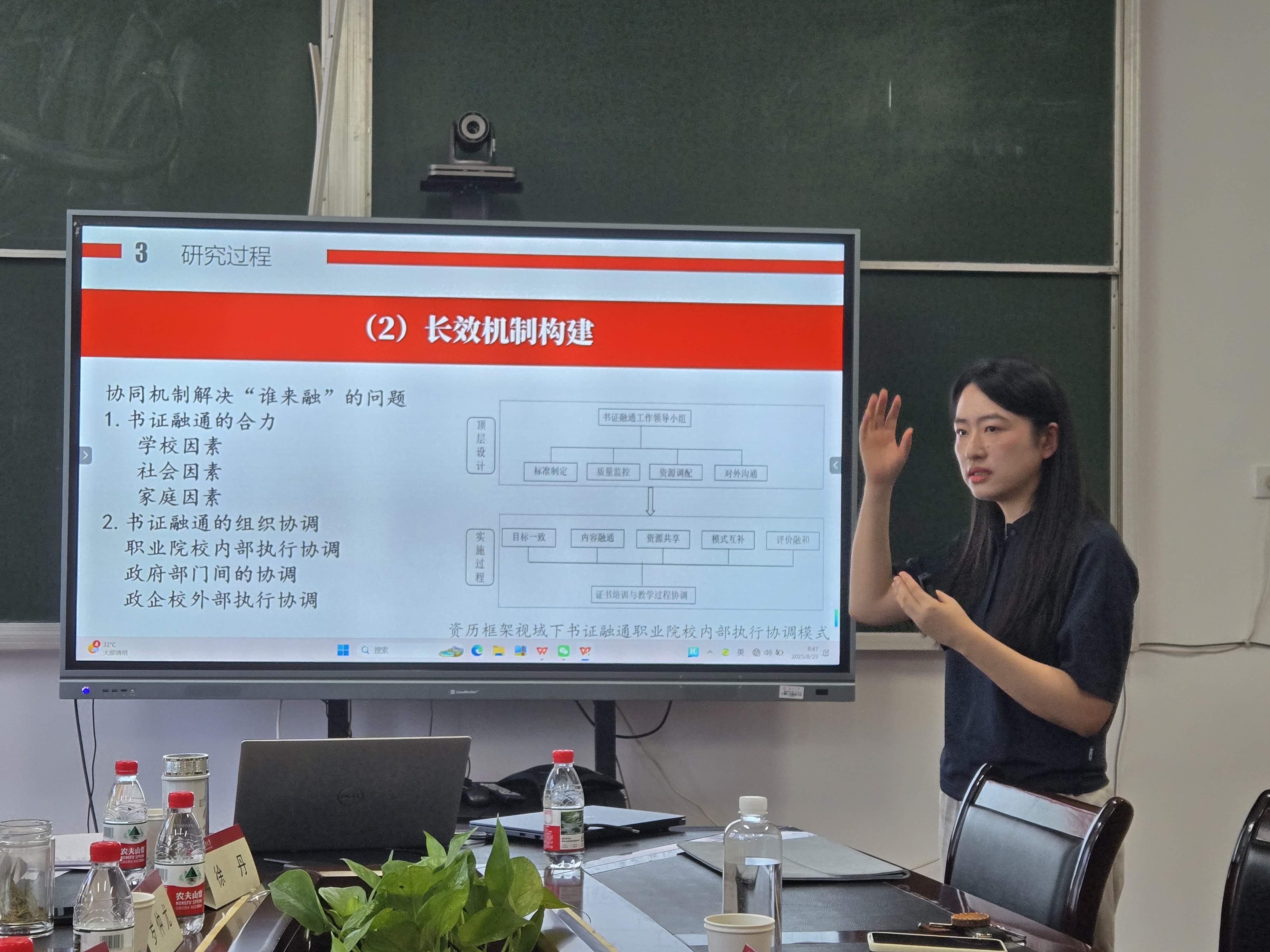 黄金梓博士以《资历框架视域下书证融通的长效机制与优化策略研究》为题,围绕研究背景与核心问题、研究思路与方法、研究内容与创新结论、未来展望与反思等几个方面,对自己的博士后研究工作进行了全面而深入的汇报。该研究立足于我国职业教育改革深化的时代背景,聚焦“书证融通”这一核心议题,系统梳理了我国职业资格证书政策的演进脉络,并通过实地访谈深入剖析了当前1+X证书制度在实践中面临的挑战。研究认为,在国家资历框架的视域下,应从动力机制、协同机制和保障机制三个维度,构建系统、稳定、长效的书证融通运行体系。报告进一步从完善顶层设计、优化治理结构和提升市场认可度等方面,为我国“书证融通”的未来发展提出了具有建设性的优化策略。