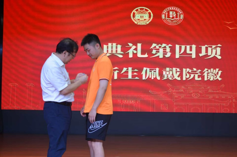 仪式由易洪波书记为新生代表张浩翔同学佩戴院徽拉开序幕。随后,这枚象征着身份与荣誉的院徽在同学们手中传递,大家相互为同伴佩戴,标志着2025级新生正式成为了一个团结友爱的集体。