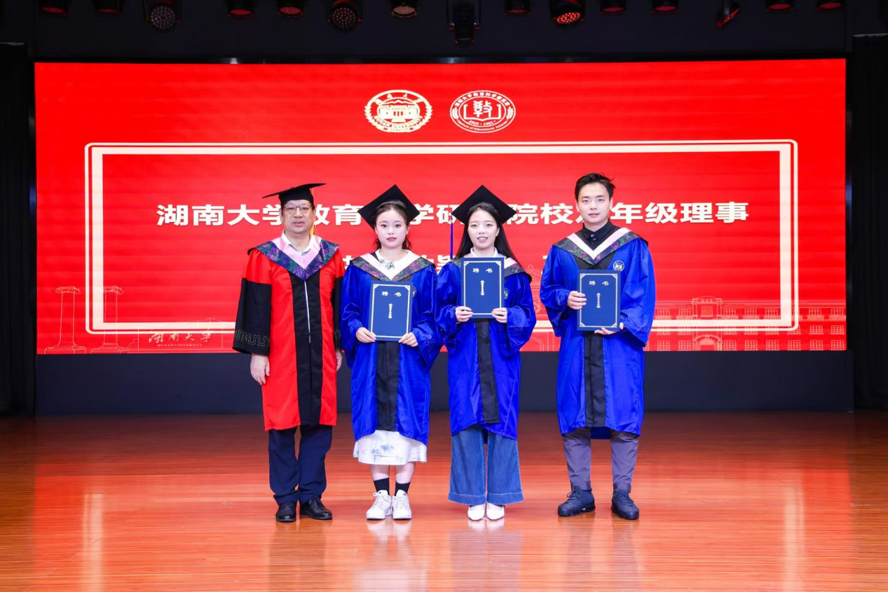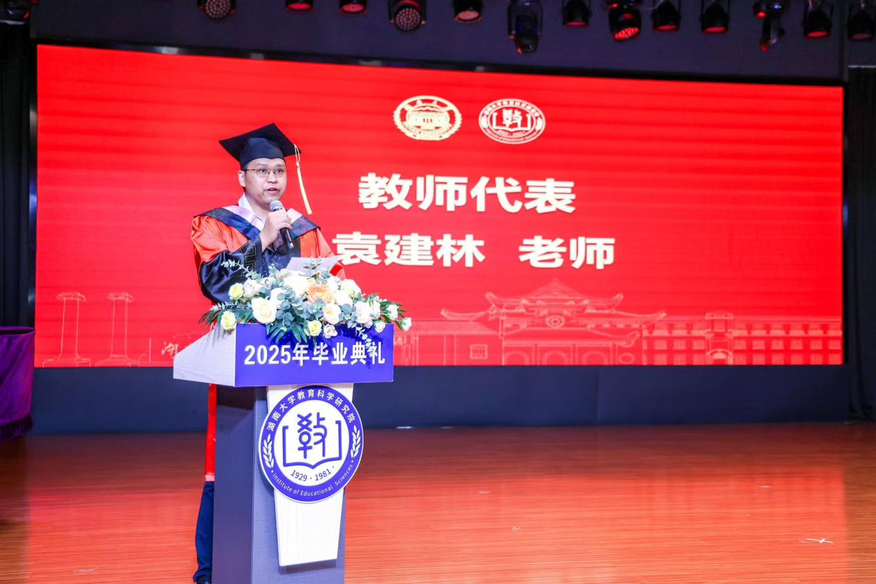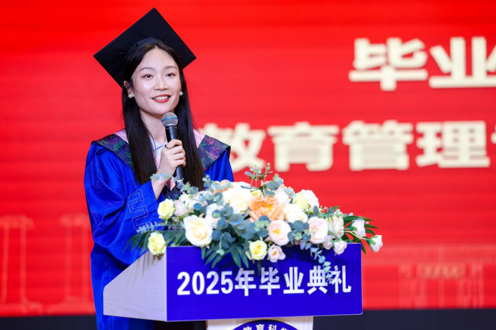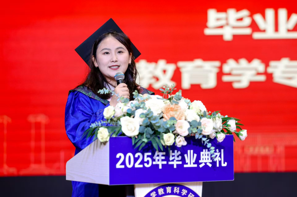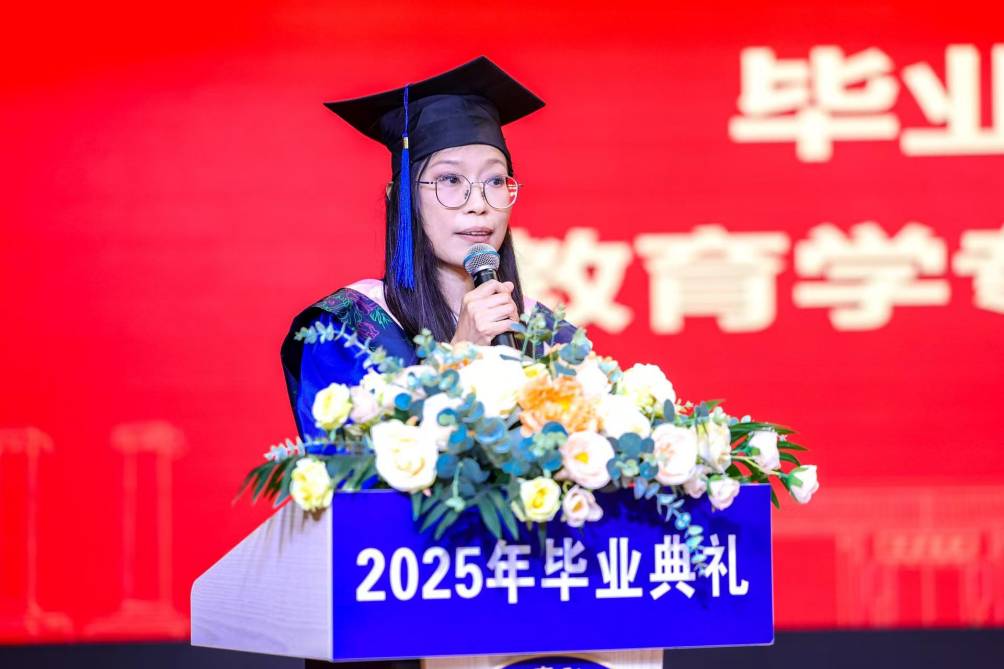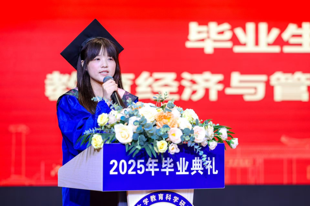 2025届毕业生代表陈金娥、陈丽文、李冰、肖思沁依次发言。她们深情回顾了在湖大伟德国际1949的求学岁月,由衷感恩师长的倾囊相授与学院的温暖关怀,亦难忘同窗珍贵情谊,衷心祝愿母校和学院葳蕤长青、桃李天下。同时郑重表示,无论未来投身何方,“湖大人”与“教科人”是永恒的烙印,也将始终铭记“实事求是,敢为人先”的校训,秉持“博学、睿思、勤勉、致知”的品格,在未来的人生道路上继续传递湖大精神,播撒理想、用奋斗绽放青春。