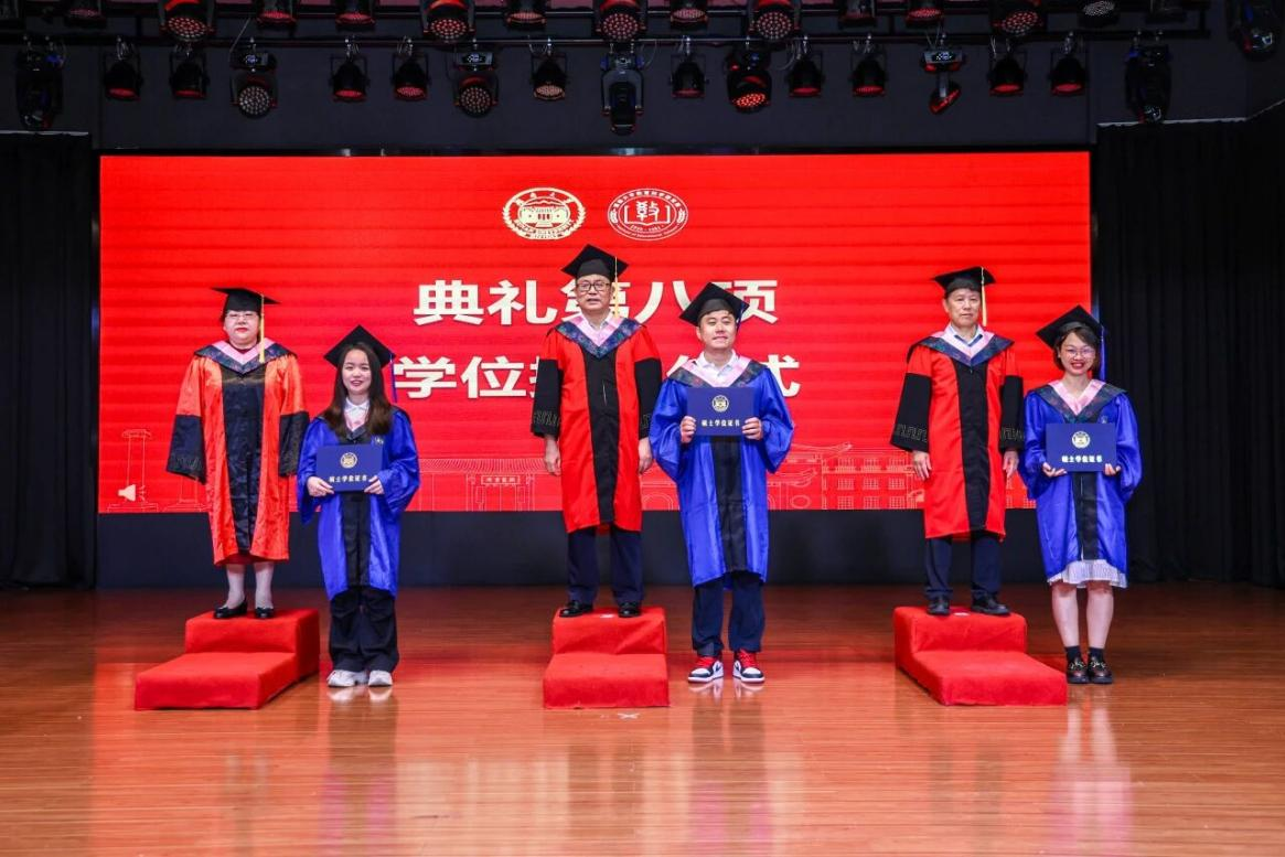 宣读完毕,毕业生依次上台,罗仲尤教授、余小波教授、蒋家琼教授为毕业生们正冠拨穗、颁发学位证书并合影留念。