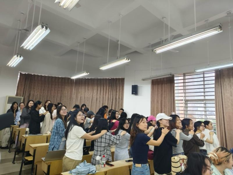 讲座伊始,向雪晴老师以互动游戏打破陌生氛围,让同学们快速融入集体。在“你好,新同学”环节,同学们通过与左右同伴打招呼、揉肩捶背等动作,初步建立联系;“你追我逃,股掌之间”游戏中,同学们站立相邻,右手食指朝上置于右侧同学左手掌心下,听指令后左手抓指、右手躲抓,欢声笑语间,大家对新环境的疏离感逐渐消散。